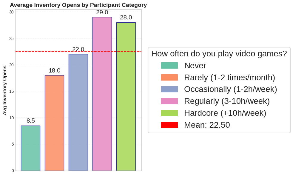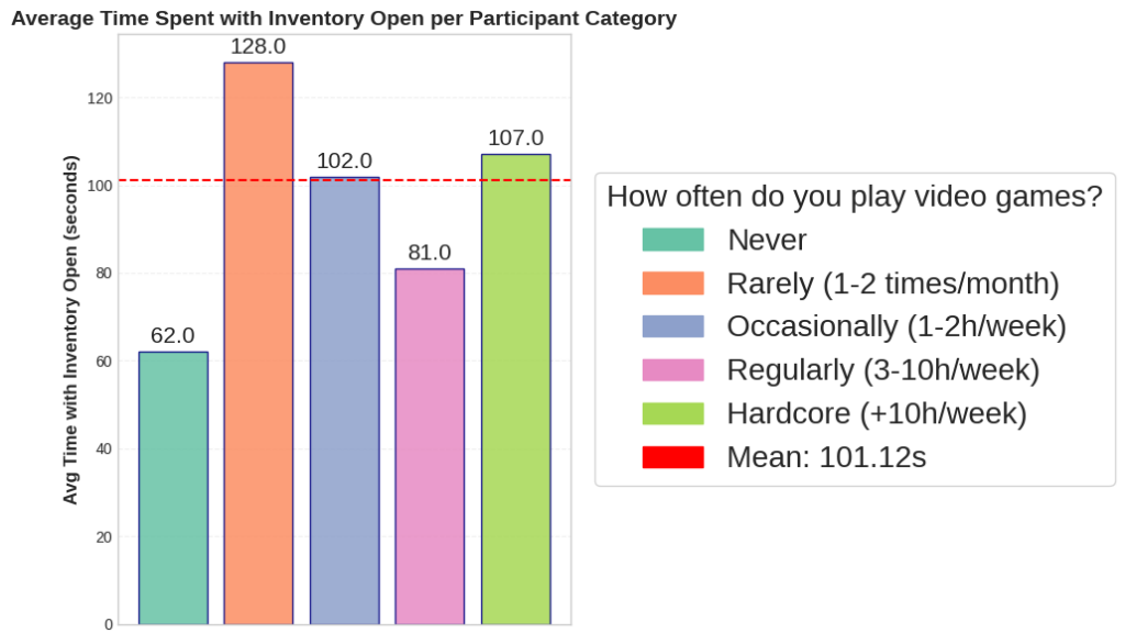 We observed a fascinating “U-shaped” relationship between experience and the time spent with the inventory open. The graph below shows this curve while demonstrating that after some gaming frequency threshold (after the “Never”) players tend to spend a lot of time to familiarize with the inventory UI. However this time decreases along the gaming categories and when analysing the hardcore players we see a considerable increase.