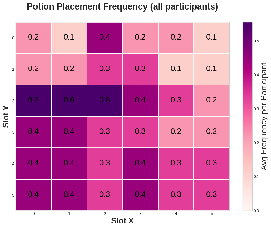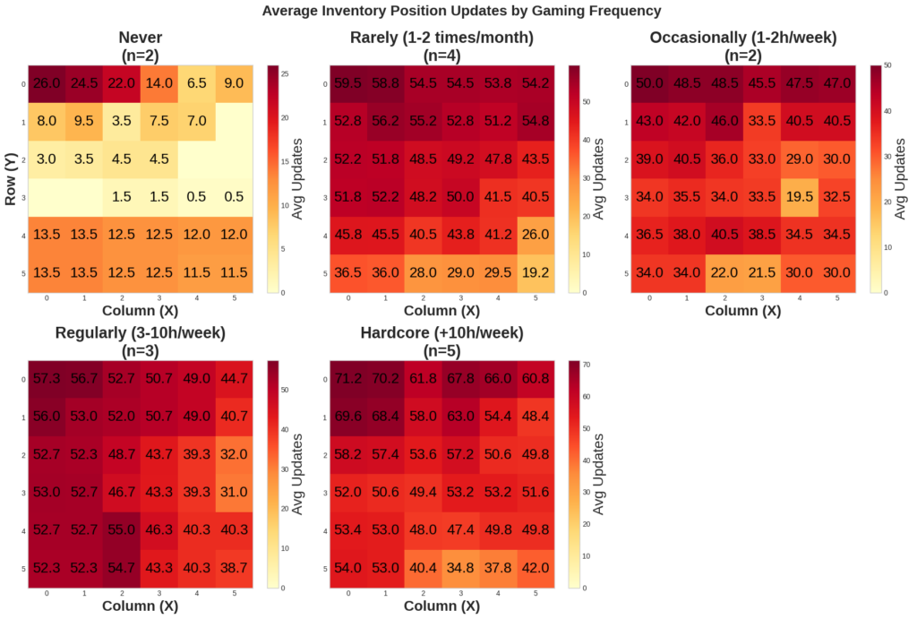 In conclusion, this study successfully demonstrated how player experience and mental models directly influence interaction strategies within grid-based inventory systems. The data confirmed that experienced players exhibit superior management efficiency, prioritizing high-value items and leveraging the UI’s perimeter—specifically the top-left corner—as a spatial anchor to reduce cognitive load. Furthermore, the clear categorical segregation observed between coins and potions indicates that players instinctively impose organized “zoning” behaviors to navigate stressful gameplay. These findings provide actionable insights for game designers, highlighting the importance of perimeter zones and intuitive spatial grouping in creating user-friendly, high-performance interfaces.