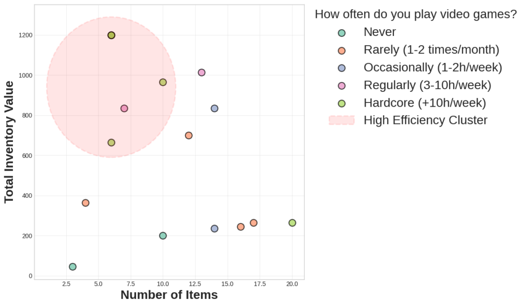 One of our primary hypotheses was that experienced players would prioritize quality over quantity. The data confirmed this: “Hardcore” players (those gaming 10+ hours a week) tended to fall into a High Efficiency Cluster. They achieved higher total inventory values while carrying fewer individual items. By mastering mechanics like aiming and movement more quickly, they freed up the “cognitive bandwidth” needed to focus on optimal item selection.