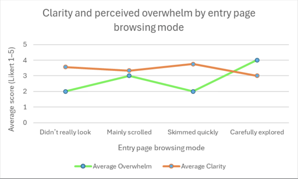 The graph comparing clarity and perceived overwhelm on the home page shows an interesting trend. Users who carefully explored the page reported higher clarity. However, they also reported feeling more overwhelmed. Users who only skimmed quickly reported lower overwhelm but also lower clarity.