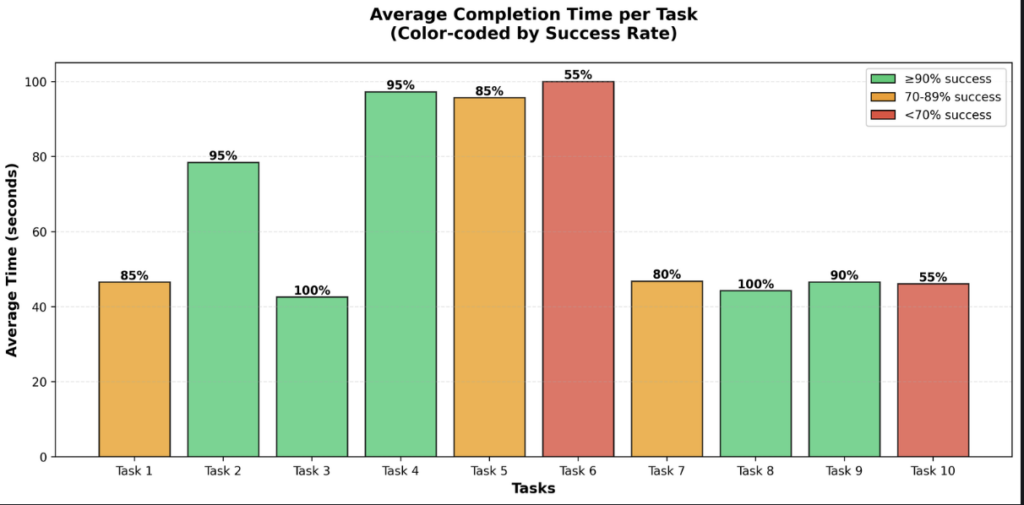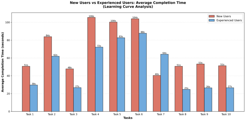 The comparison between new users and experienced users shows that experienced users completed tasks faster. However, new users improved quickly across tasks. This indicates that the platform has relatively good learnability. So, the onboarding and first interaction could be improved.