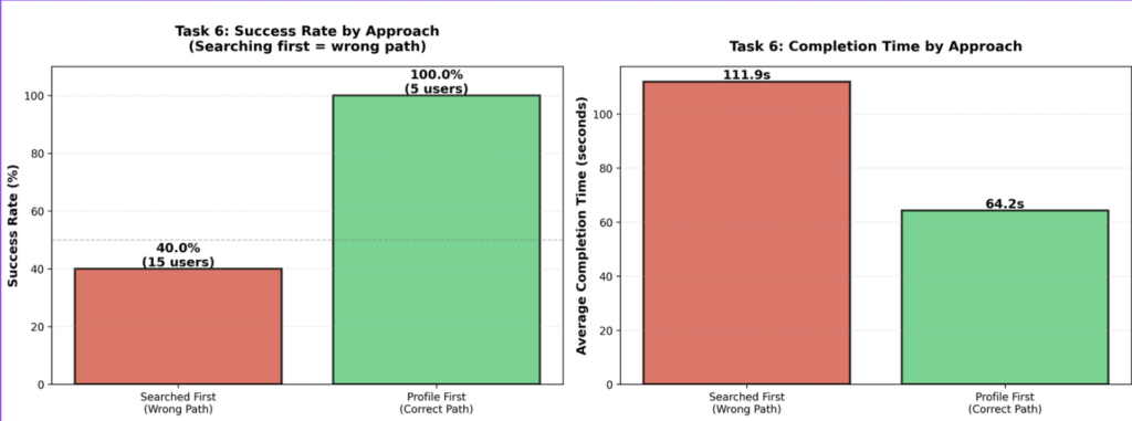 The first graph shows that users who searched first had a low success rate of 40 percent, while users who went directly to the profile section had a 100 percent success rate. This means the correct path exists, but it is not intuitive.