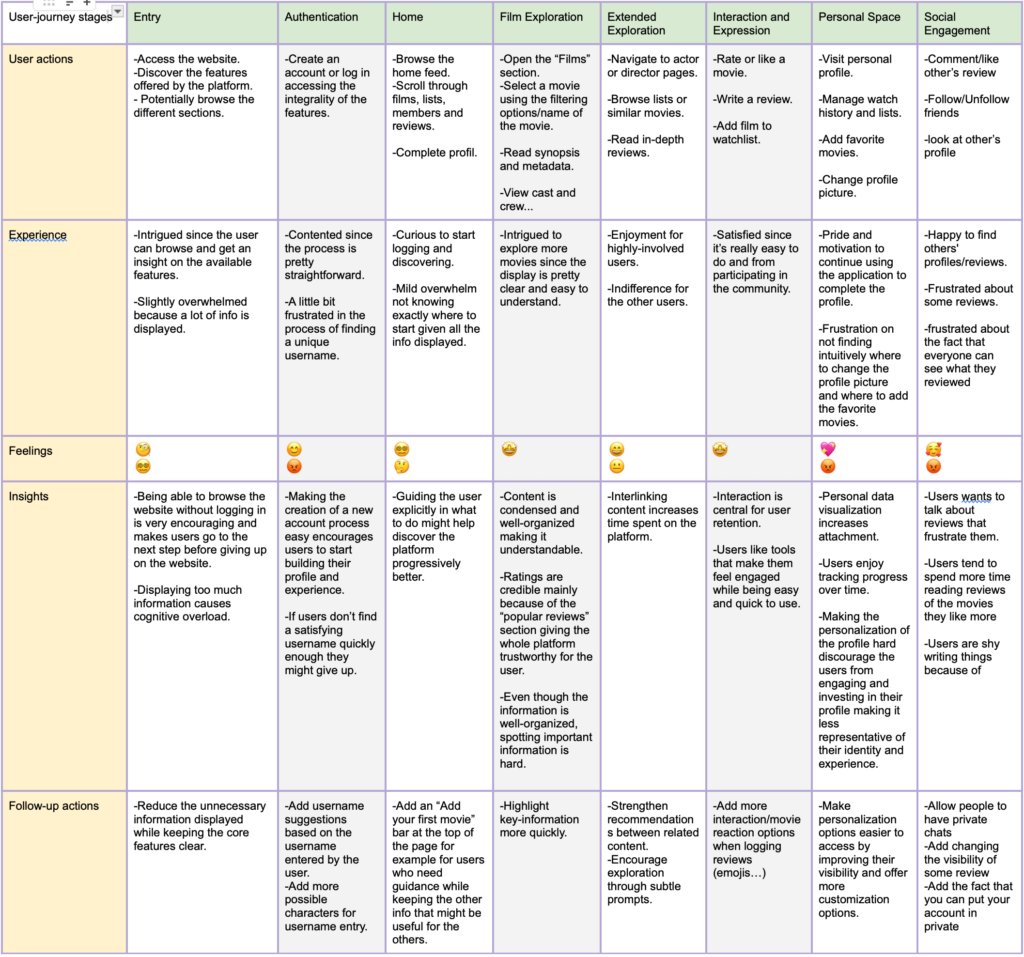 To structure our evaluation, we mapped out the core user journey covering entry, authentication, home feed browsing, film exploration, and personal space customisation. A key insight from this journey is that at almost every stage we got both a mix of positive and negative emotions from users. For example, some expressed excitement at the content and suggestions on Home page while others expressed overwhelm.