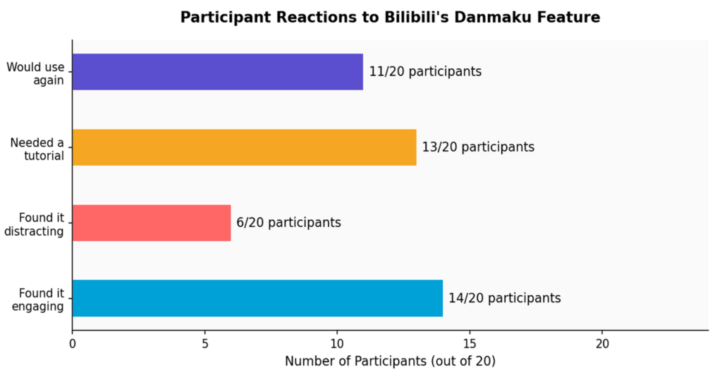 This was the most surprising result: Bilibili outperformed YouTube on the social interaction task. Participants completed it faster on Bilibili (127.7s vs 143.1s) with a higher success rate. The reason is structural: danmaku keeps you engaged while watching, without needing to stop and scroll to a separate comment section. The chart below shows how participants reacted to danmaku: