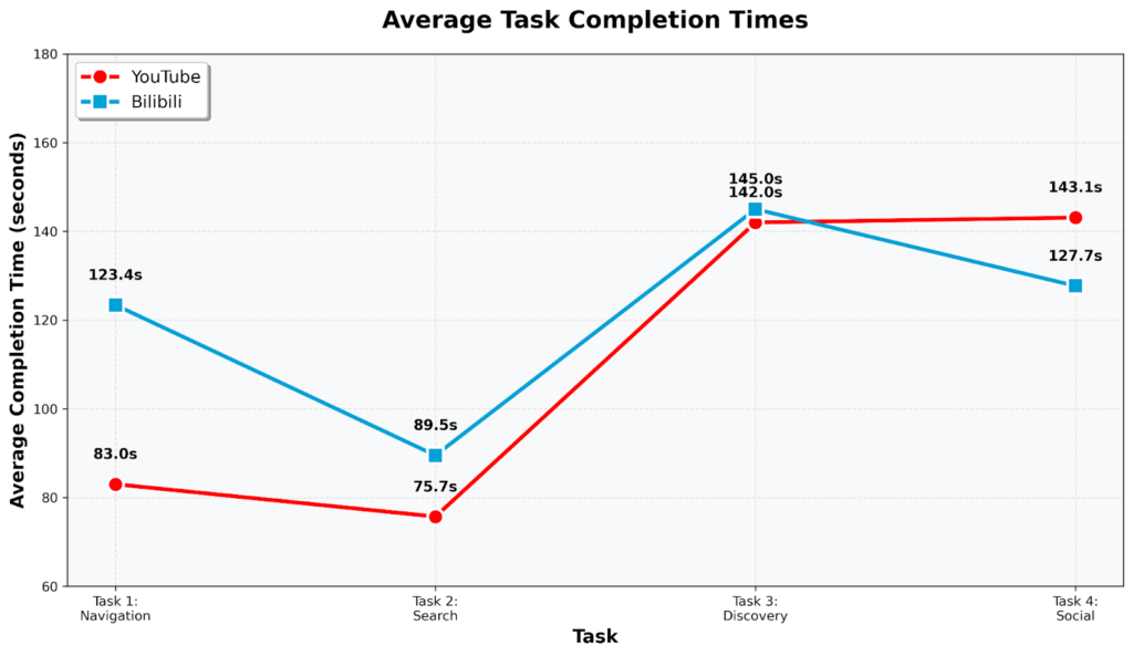 YouTube was faster on most tasks, but Bilibili was faster on Task 4. The completion time chart makes this pattern easy to see:
