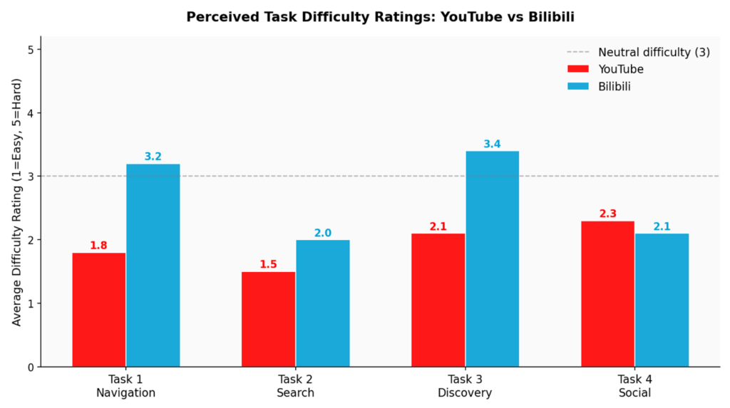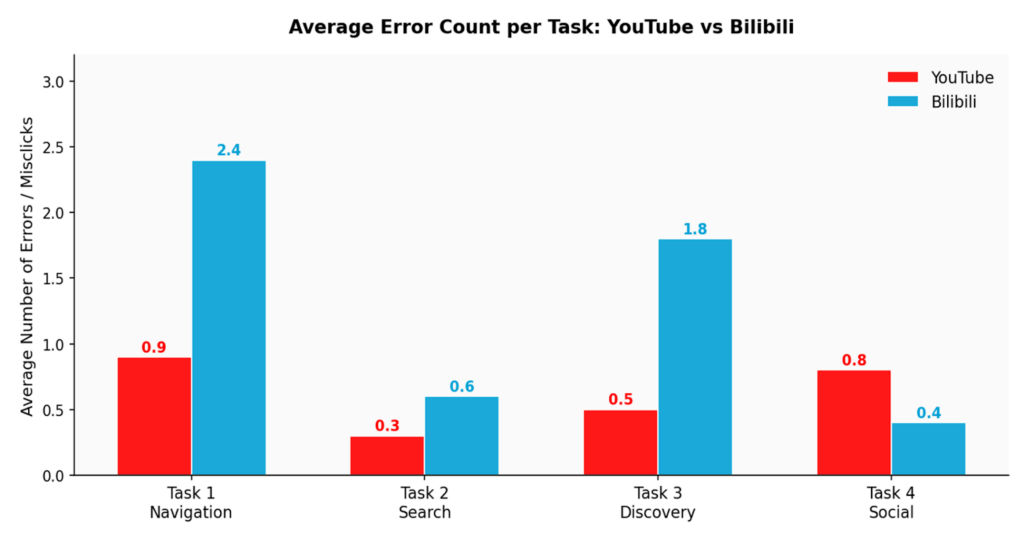 Bilibili had more errors, longer completion times, and higher difficulty ratings on every task that involved navigating the interface. Task 4 (social features) was the clear exception: Bilibili’s danmaku design is actually more efficient for social interaction than YouTube’s comment scroll.