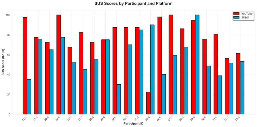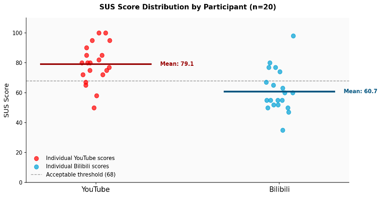 YouTube received 79.1 (acceptable range) while Bilibili received 60.7 (marginal range). A paired t-test confirmed this difference is statistically significant. Almost every participant pair shows YouTube scoring higher.