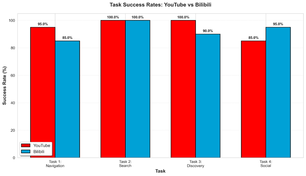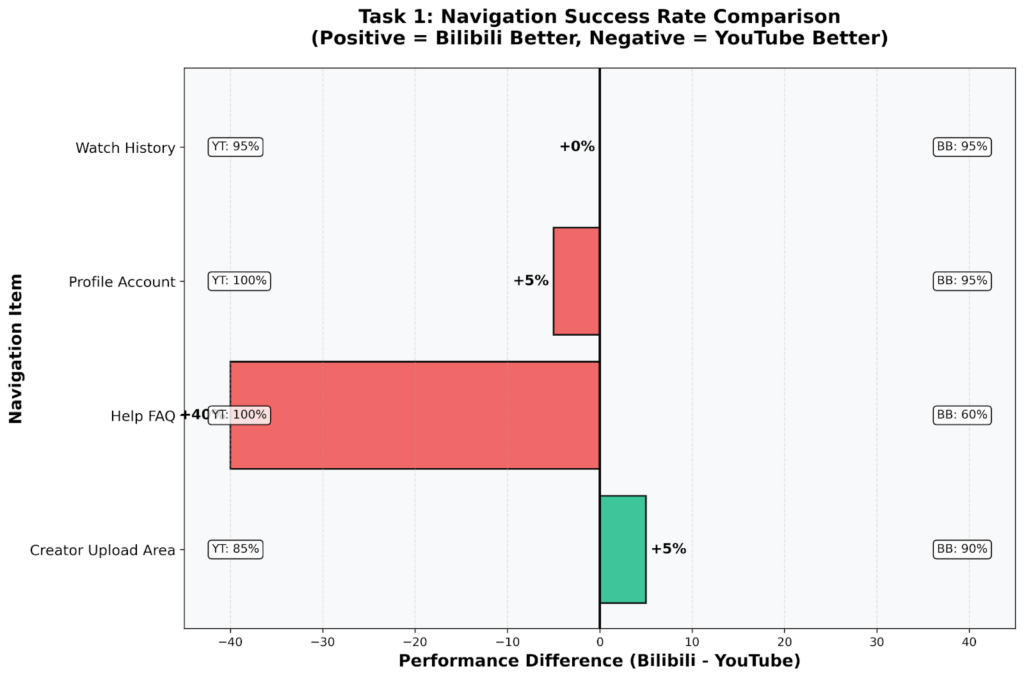 Navigation was the task with the clearest usability gap. On YouTube, users quickly found the familiar left-side sidebar. On Bilibili, the dense top navigation with dozens of categories caused significant confusion. The Help/FAQ section was the hardest item to find on Bilibili: only 60% of participants located it successfully.