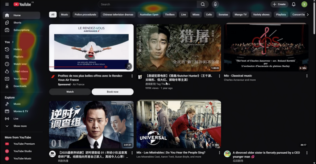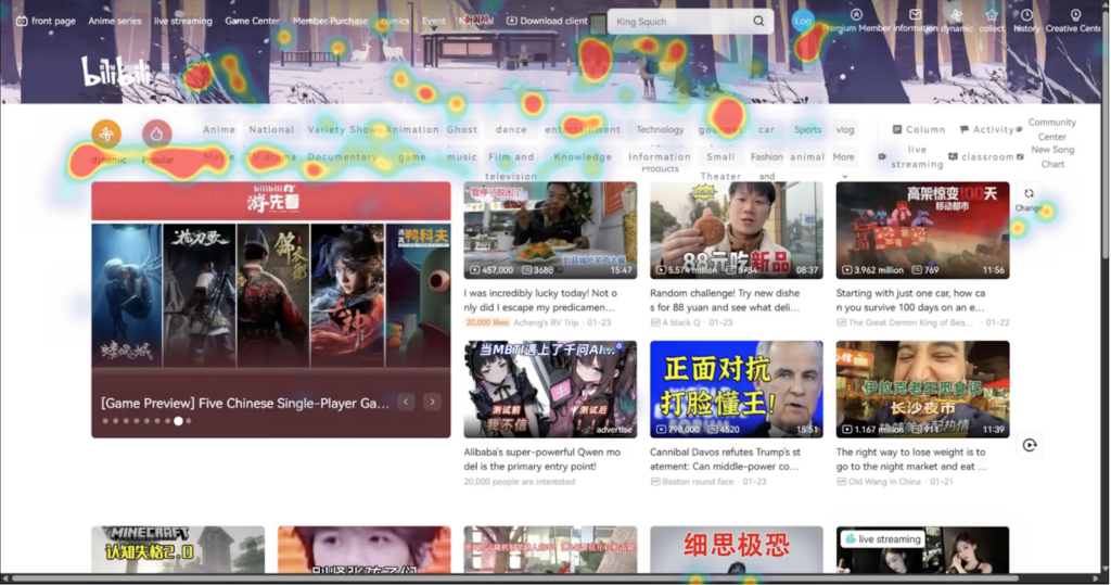 The attention heatmaps captured by CursorTracker show the same contrast visually. On YouTube, user attention clusters around the sidebar, search bar, and profile icon. On Bilibili, attention is spread all over the page, a clear sign of confusion about where to look: