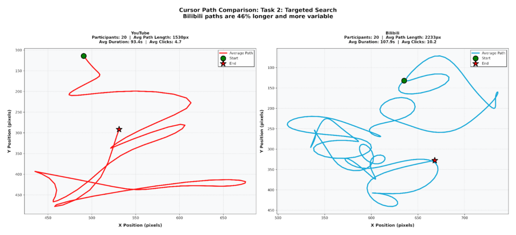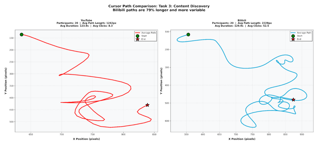 We counted the number of misclicks and navigation errors per task. Bilibili consistently had more errors on navigation-heavy tasks, reflecting the disorientation shown in the cursor paths: